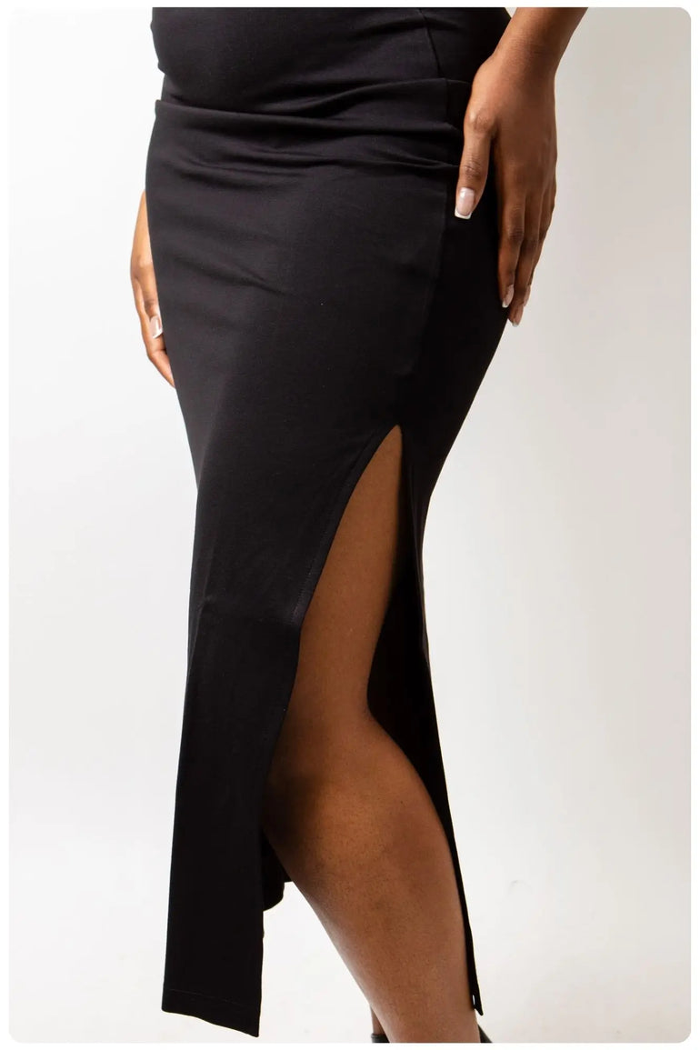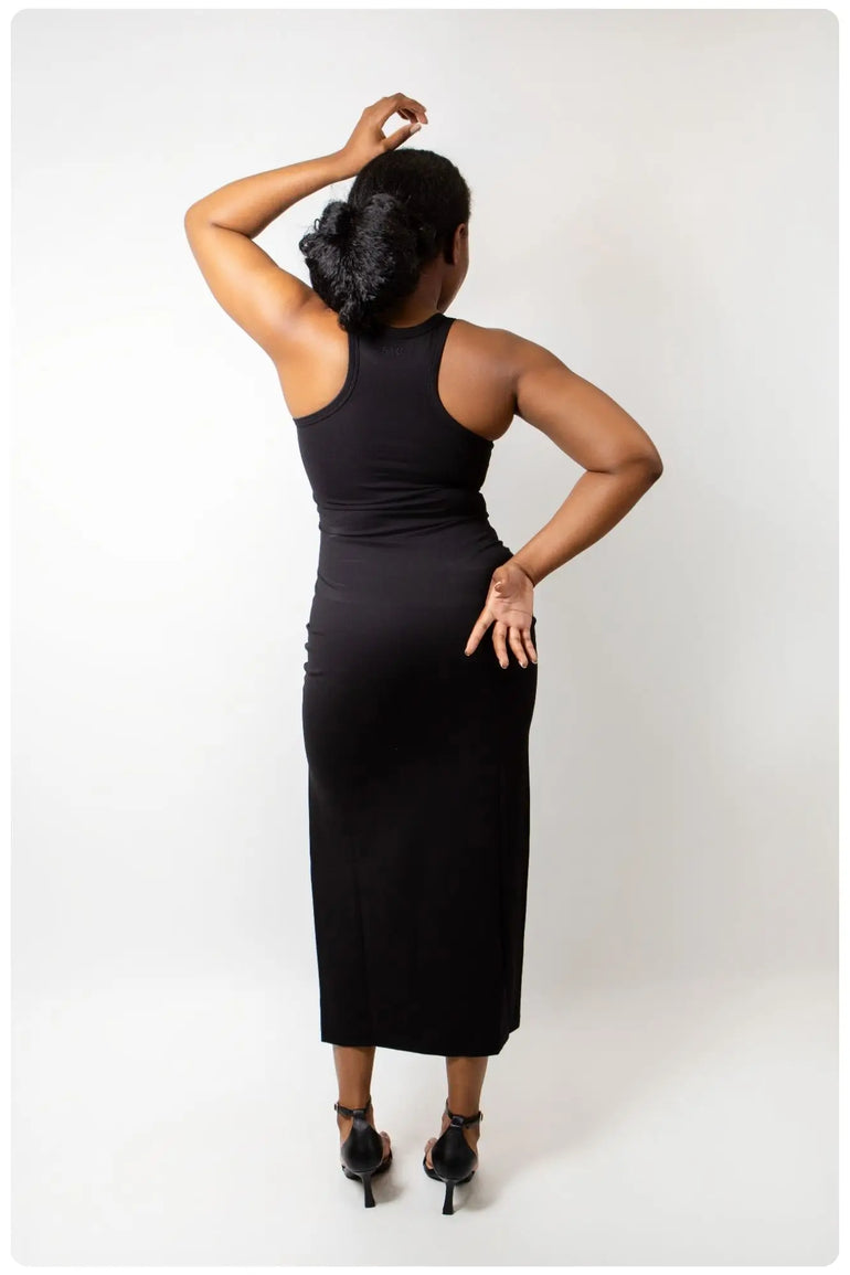 Made from our signature thick fabric, this midi dress provides medium compression, high stretch, and recovery, ensuring a smooth and comfortable fit. The high sides allow for the option of a strapless bra, though the design is perfect for going braless if you prefer.