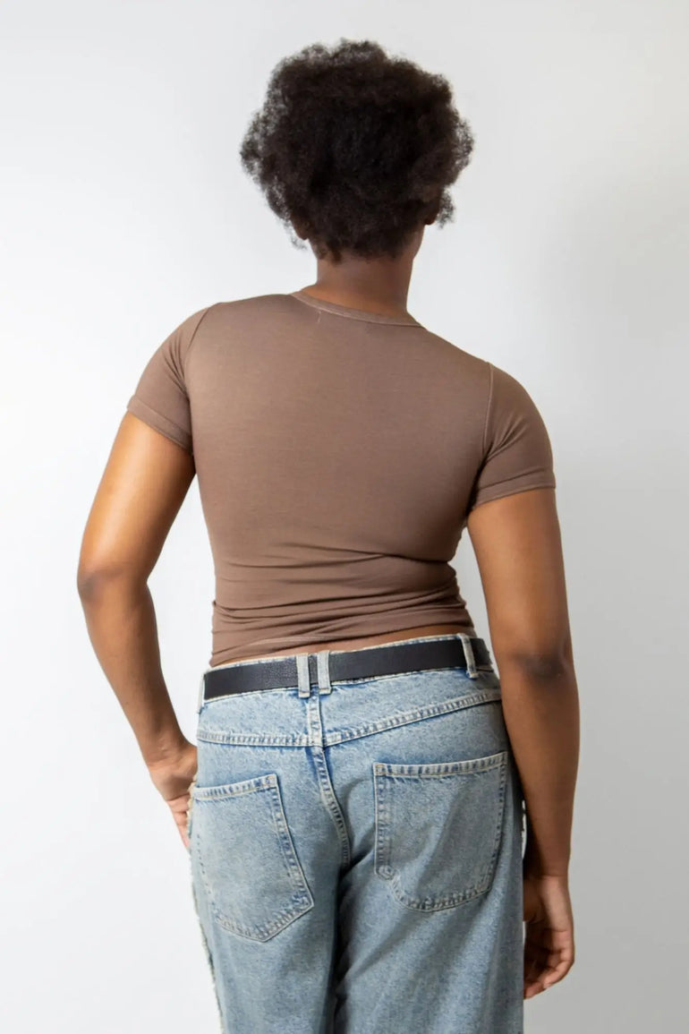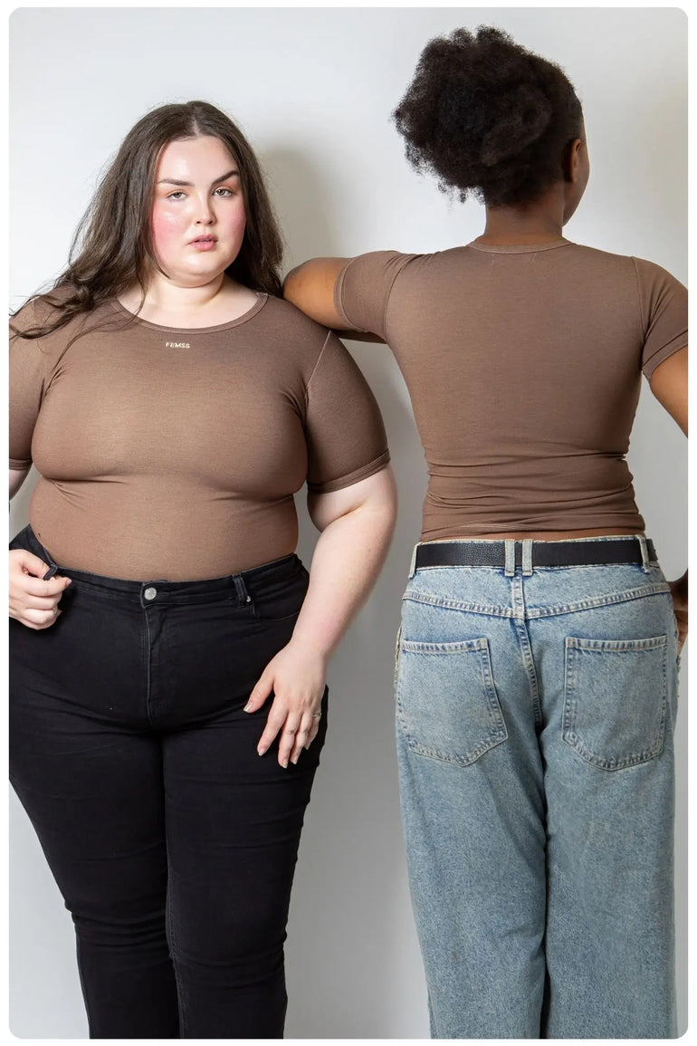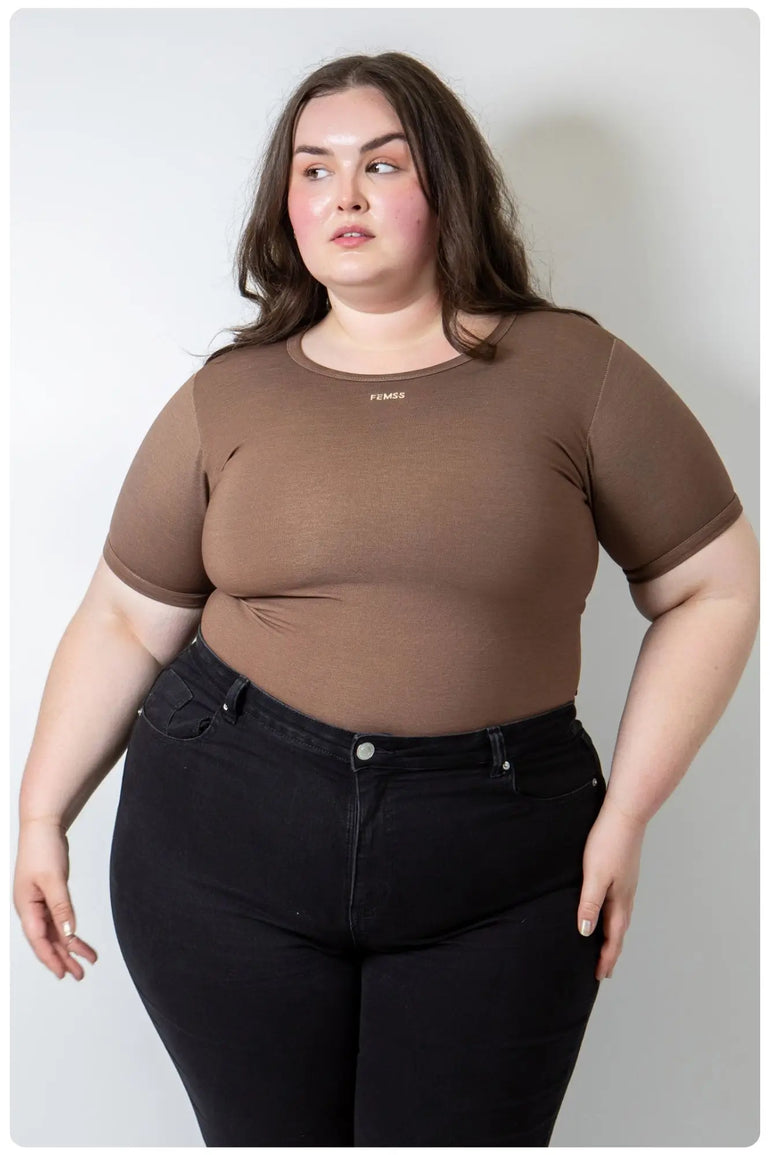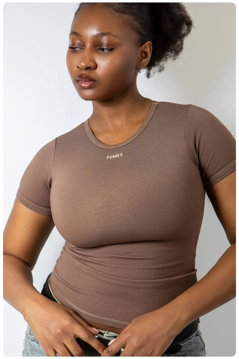 Indulge in ultimate luxury with the FEMSS Luxury Fitted T-Shirt, now available in a  versatile Soft Brown. Crafted from our Signature Luxe fabric, this t-shirt flawlessly combines form and function, delivering a garment that is as breathtaking as it is supportive.